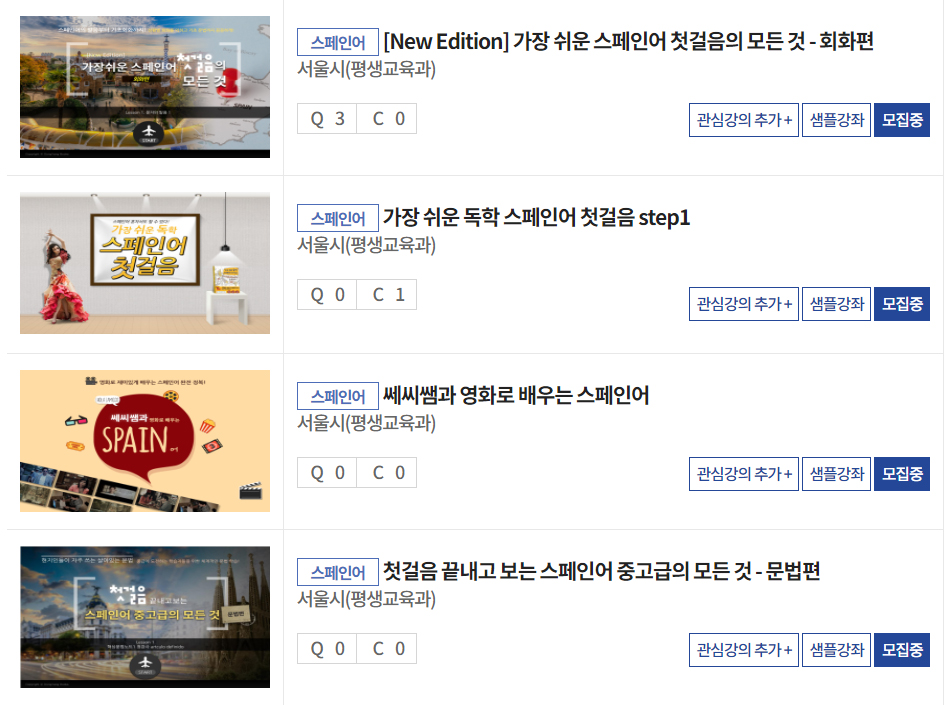 서울시교육청 전자도서관, 서울시평생학습포털, 경기도평생학습포털(GSEEK) 세 사이트에서 스페인어 무료 강의를 정리한 것 입니다. 지금은 무료 강의지만 무료 서비스가 언제 종료될 지 알 수 없으므로 지금 당장 확인하는 것을 추천합니다.
