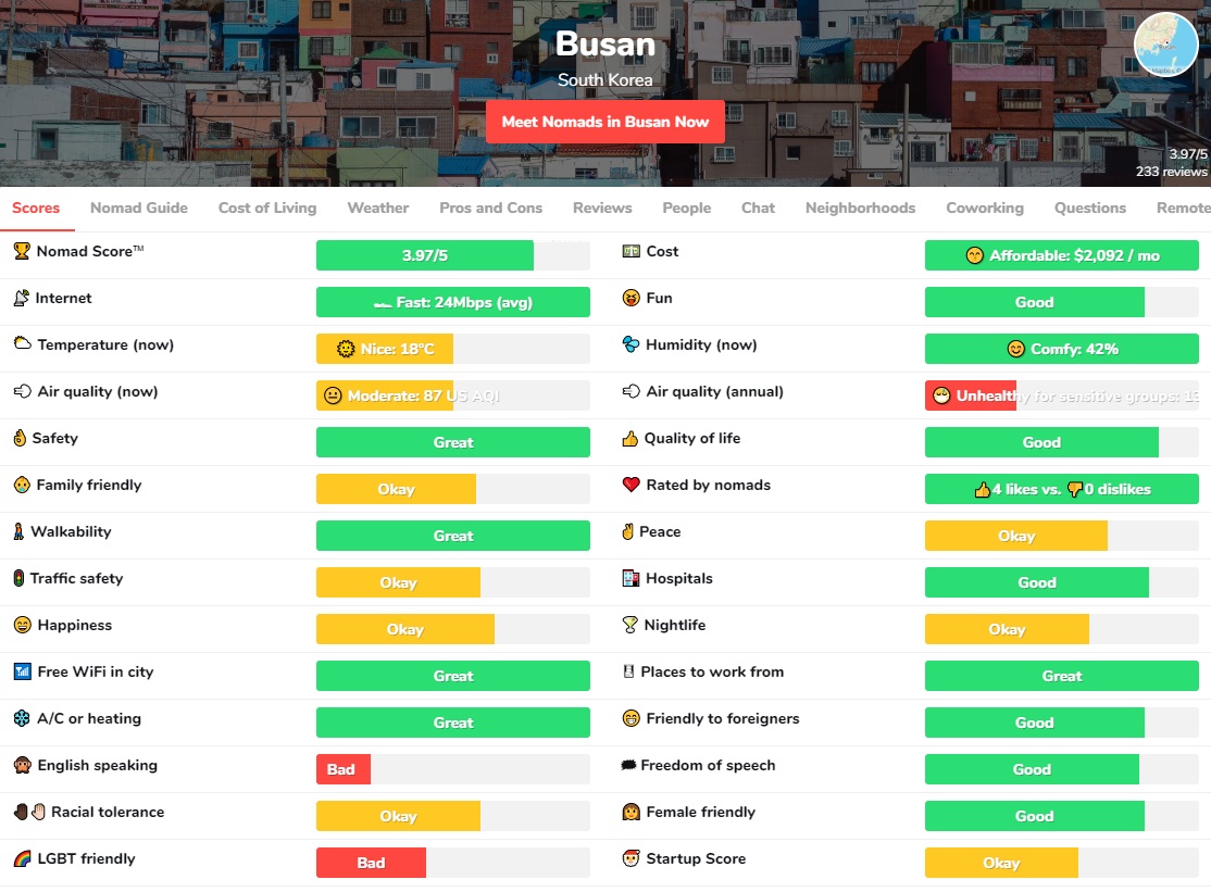 우리나라에서 서울 다음으로 높은 3.97점의 노마드 스코어를 기록한 도시는 부산입니다. 서울과 비슷하게 인터넷 속도, 치안, 의료, 작업 장소, 여성 친화, 무료 와이파이, 냉난방 등에서 높은 평가를 받았고 외국인 친화성, 보행성에서도 높은 평가를 받았습니다. 반면 대기질, 영어 사용, LGBT 친화성, 인종적 관용, 나이트라이프 등 항목에서는 낮은 평가를 받았습니다.