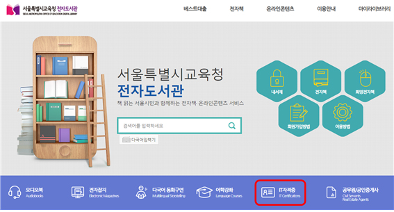 회원가입을 완료했다면 서울특별시교육청 전자도서관 홈페이지에 접속 후 로그인합니다. 로그인 후 전자도서관 메인화면에서 IT 자격증 부분을 클릭하고 다시 서비스 바로가기를 클릭하면 ITGO(아이티고) 홈페이지로 연결됩니다.