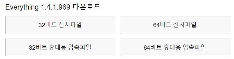 서치 에브리띵은 voidtools 홈페이지에서 다운받을 수 있습니다. 글을 올리는 현재 가장 최신 버전은 Everything 1.4.1.989입니다. 본인 윈도우가 32비트인지 64비트인지 확인한 후 해당하는 비트의 설치파일 또는 휴대용 압축파일을 다운로드 합니다.
