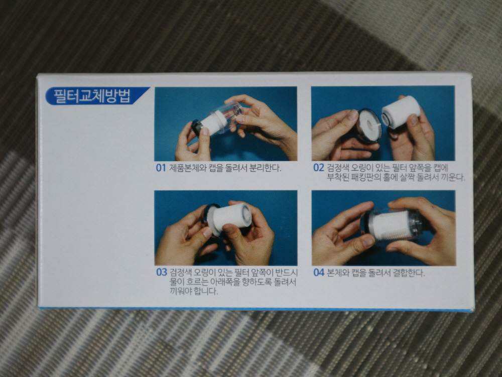 필터교체방법은 아주 간단합니다. 캡을 돌려서 헤드를 분리한 뒤 그림을 보고 방향에 맞춰 필터를 넣고 다시 설치하면 됩니다. 처음에는 방향이 살짝 헷갈리기도 했지만 2개월마다 필터를 교체해주니 이제는 금방 교체할 수 있습니다.