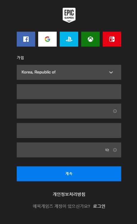 에픽게임즈 회원가입이 되어있다면 바로 로그인을 하면 되고, 회원가입이 안되어 있다면 아래 가입 버튼을 눌러서 가입합니다.