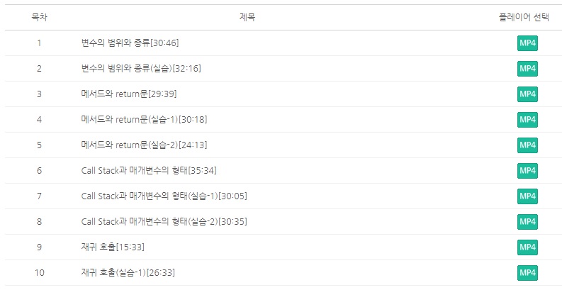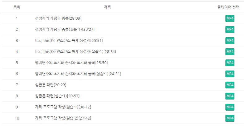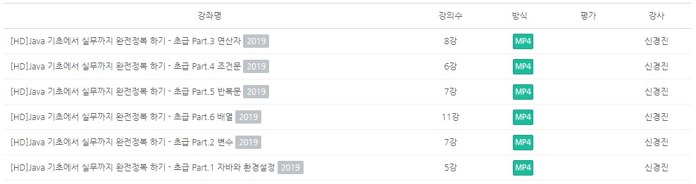 초급 강좌는 자바를 아주 처음 시작하는 입문자가 수강하기에 적합한 수준입니다. 총 6개의 강좌로 구성되어 있고 각 강좌마다 5~11강으로 이루어져있습니다. 설명보다는 강좌명을 보는 게 이해가 더 빠르겠죠?