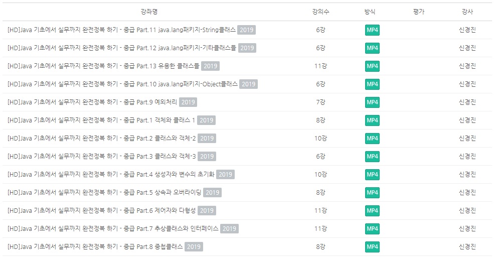 중급 강좌는 초급 수준을 벗어난 사람들이 수강하기에 적합한 강좌입니다. PART1부터 PART13까지로 강좌 수가 늘어났습니다. 객체, 클래스의 개념부터 상속, 오버라이딩, 추상클래스, 중첩클래스, 예외처리 등 본격적으로 JAVA를 배운다는 느낌이 듭니다.
