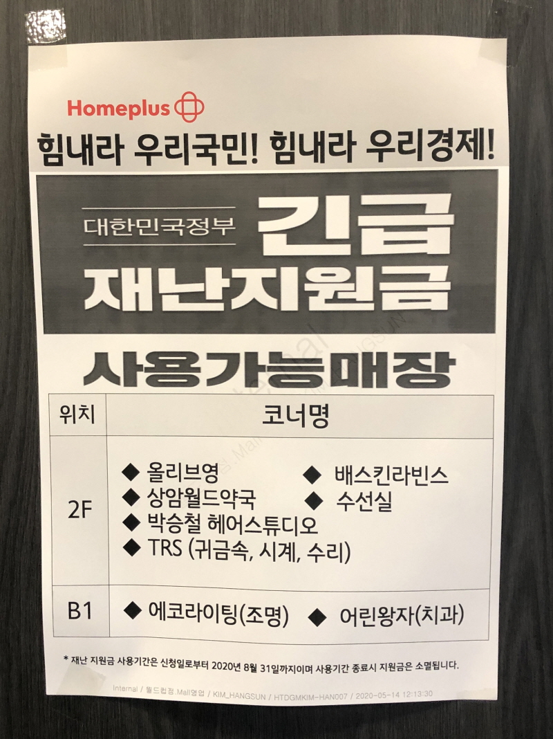 어제 상암 월드컵경기장에 있는 홈플러스 월드컵점에 다녀왔습니다. 재난지원금을 사용하러 간 것은 아니고 급하게 전자제품을 볼 일이 있어서 잠시 들렀는데요. 대한민국정부 긴급재난지원금 사용 가능한 매장에 대한 안내가 있어서 찍어왔습니다. 5월 16일 토요일에 찍은 안내입니다.