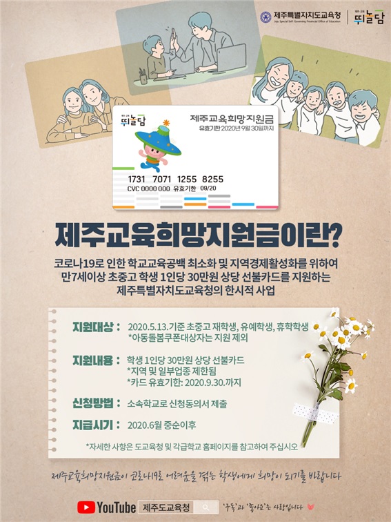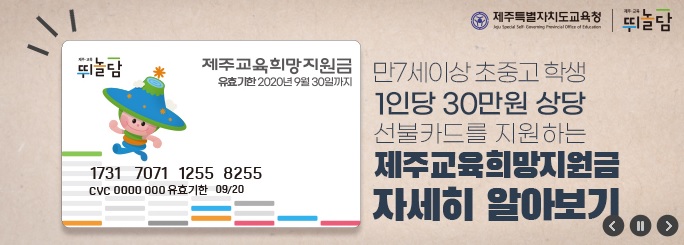 우선 제주교육희망지원금이 무엇인지 알아야겠죠. 제주교육희망지원금은 제주도교육청에서 코로나19로 인한 학교교육공백을 최소화하고 지역경제를 활성화하기 위해 만 7세 이상 초중고등학생 1인당 30만원 상당의 선불카드를 지원하는 한시적 사업입니다.