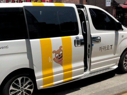 몇 분 기다리니까 카카오 캐릭터가 그려진 흰색 스타렉스가 왔습니다. 카카오T라고 적혀 있는 것만 빼면 이전 타다 베이직 서비스랑 꼭 닮았습니다.