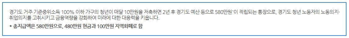 경기도 청년 노동자의 노동 의지와 취업 의지를 고취시키고 금융 역량을 강화시키기 위해 시행하는 사업이라고 합니다.