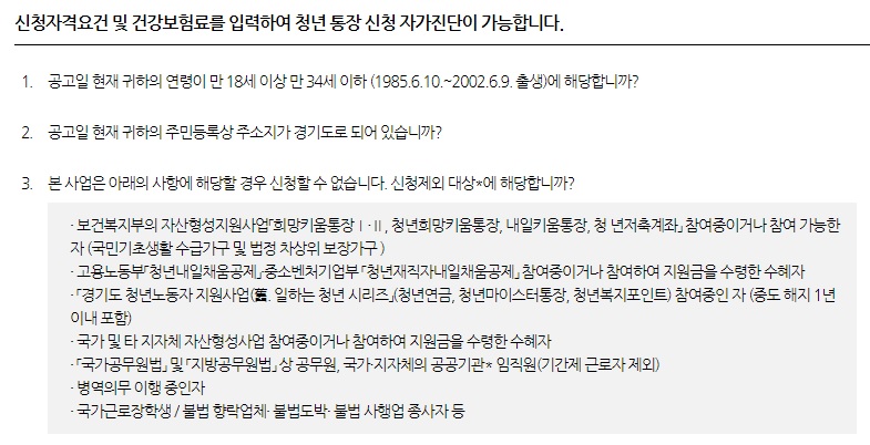 신청자격이 어려워도 걱정하지 마세요. 경기도 청년 노동자 통장 홈페이지에서 지원자격을 확인할 수 있는 서비스가 있으니 어렵지 않게 확인할 수 있습니다.