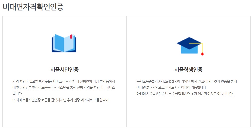 서울시민인 분들은 도서관에 방문하지 않아도 비대면 자격확인을 통해 전자도서관을 이용할 수 있습니다.