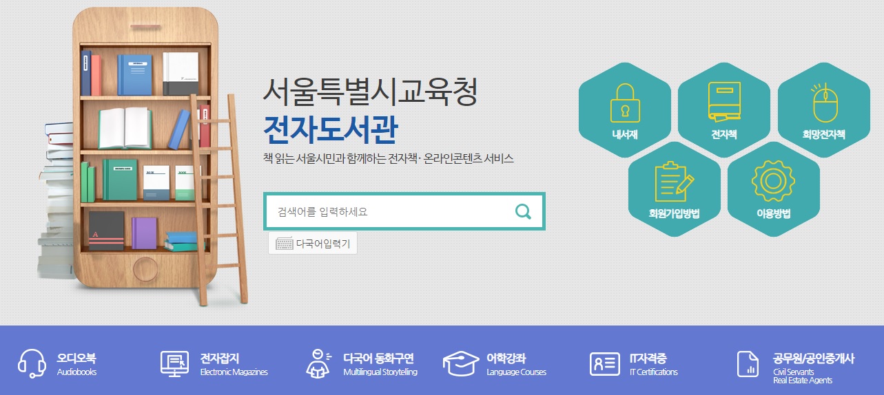 서울시교육청 전자도서관에서는 서울시민들을 대상으로 어학 강좌, 공무원 강의, 자격증 강의, IT 강의, 오디오북, 전자잡지 등 다양한 서비스를 무료로 제공하고 있습니다.