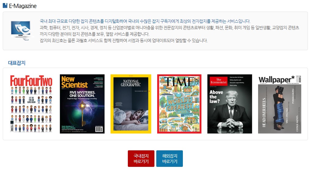 로그인을 하셨다면 전자도서관(e-lib.sen.go.kr)에 접속 후 ‘온라인콘텐츠 – 전자잡지 – 국내잡지 바로가기’를 클릭합니다.