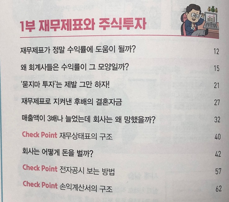 재무제표가 정말 수익률에 도움이 될까? 왜 회계사들은 수익률이 그 모양일까? ‘묻지마 투자’는 제발 그만 하자! 재무제표로 지켜낸 후배의 결혼자금 매출액이 3배나 늘었는데 회사는 왜 망했을까? [Check Point] 재무상태표의 구조 회사는 어떻게 돈을 벌까? [Check Point] 전자공시 보는 방법 [Check Point] 손익계산서의 구조
