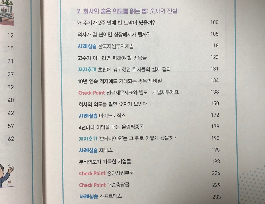 경제학 이론서나 주식 이론서였다면 몇 쪽 넘기지 못하고 금방 포기했을 것 같다. 하지만 이 책에는 예전 기업의 사례를 중간 중간 다루고 있어 조금 더 흥미롭게 읽을 수 있다. 특히 실제로 상장폐지된 기업의 사례 등을 보면서 더 집중해서 책을 읽을 수 있었다.