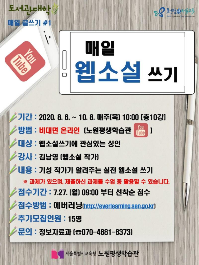 7월 27일부터 에버러닝 홈페이지를 통해 선착순으로 모집합니다. 예전에는 도서관에서 직접 수업을 들었는데 최근 코로나 이후에는 강의를 비대면 유튜브로 진행하나 봅니다.
