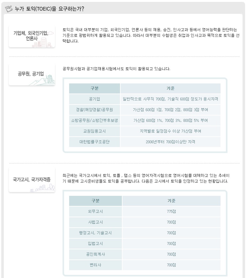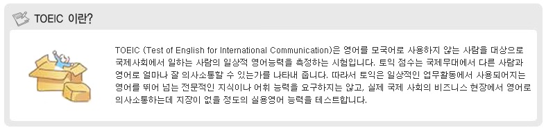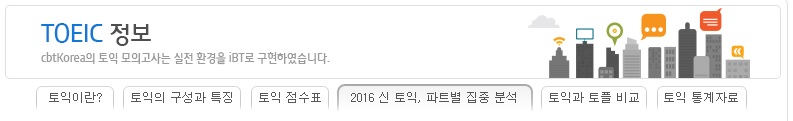 토익 시험에 대한 설명이라든가 토익의 구성과 특징, 토익 점수표, 신 토익 파트별 집중 분석, 토익과 토플의 비교, 토익 통계자료 등을 제공합니다.