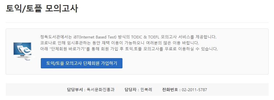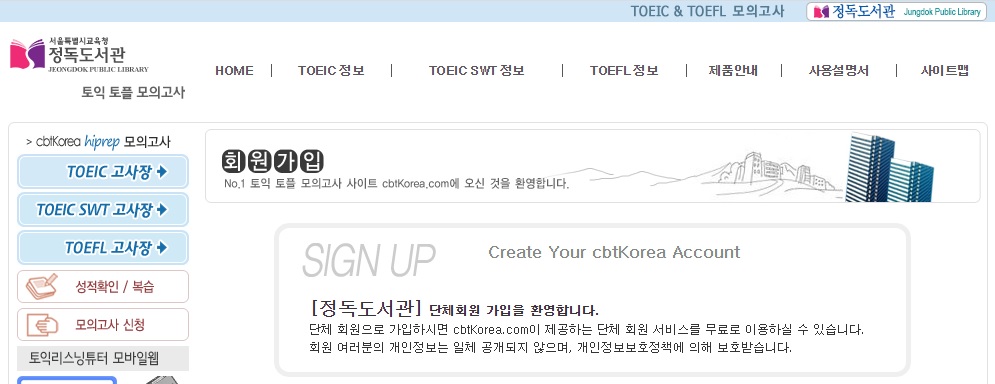 정독도서관에 가입을 완료하셨다면 이번에는 ‘토익/토플 모의고사 단체회원’으로 가입해야 합니다.