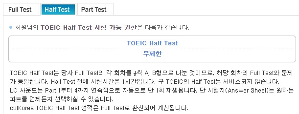Half Test는 Full Test의 각 회차를 1/2씩 A, B형으로 나눈 것이므로, 해당 회차의 Full Test와 문제가 동일합니다. Half Test 전체 시험시간은 1시간입니다. 구 TOEIC의 Half Test는 서비스되지 않습니다.