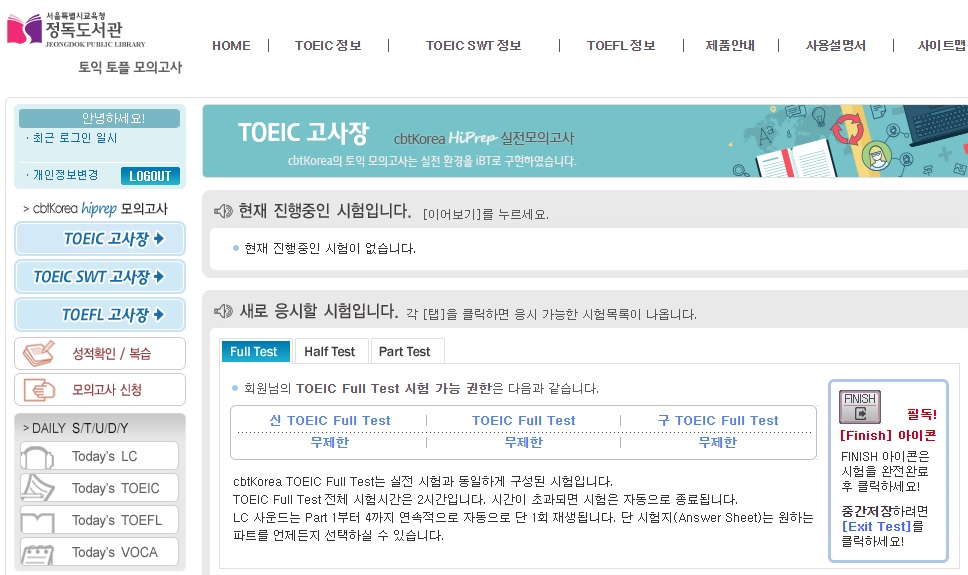 Full Test는 신 TOEIC Full Test, TOEIC Full Test, 구 TOEIC Full Test로 나눠져 있습니다. 원하는 토익 시험을 골라서 응시하면 됩니다.