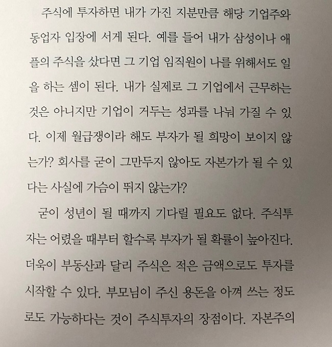 책을 다 읽은 후에 나도 학생 시절부터 주식을 알았으면 어땠을까 하는 아쉬움도 생기고 지금이라도 늦지 않았으니 지금 당장 주식을 시작해야겠다는 생각도 든다.