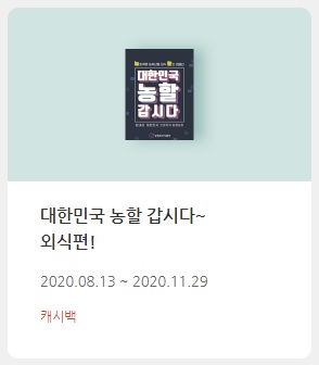 농림축산식품부, 한국농수산식품유통공사에서 코로나로 어려운 외식업체를 지원할 수 있게 지원하는 이벤트입니다.