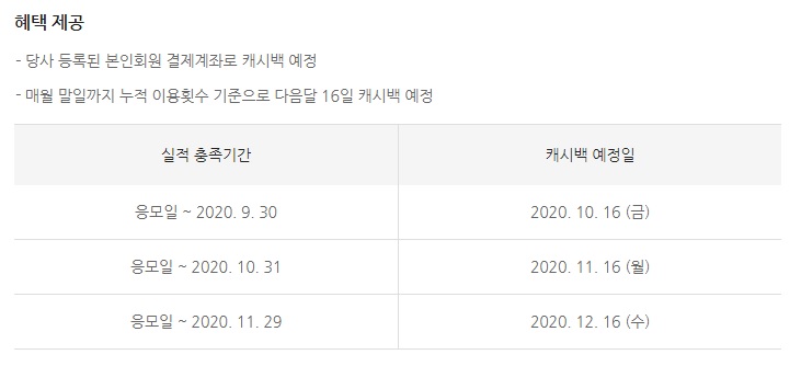 캐시백은 매월 말일까지 누적 이용횟수 기준으로 다음달 16일에 캐시백으로 제공할 예정이라고 합니다.