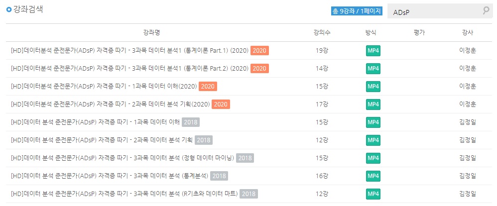 데이터분석 준전문가 이정훈 강사의 2020년 최신 강의와 함께 김정일 강사의 2018년 강좌도 수강이 가능합니다.