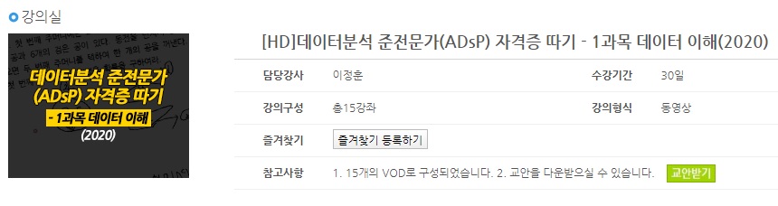 각 강의마다 교안을 제공하고 있어 따로 교재를 구입하지 않아도 강의를 진행할 수 있을 것 같습니다. 필기 시험 과목인 데이터 이해, 데이터 분석 기획, 데이터 분석 3과목을 모두 제공하고 있어서 전자도서관 ADsP 강의만으로도 준비가 가능할 것 같습니다.