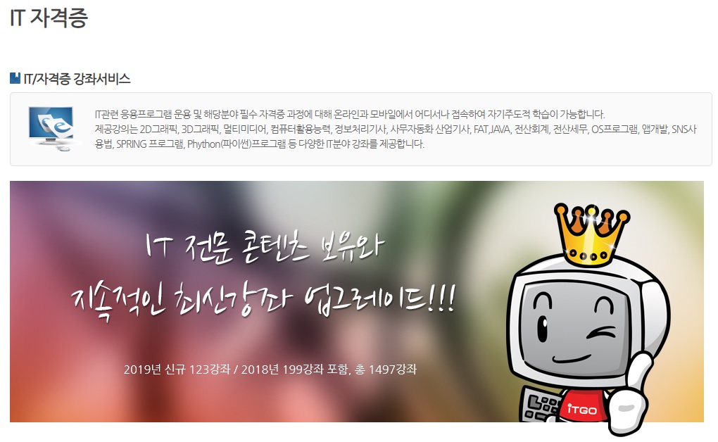 서울시교육청의 전자도서관(http://e-lib.sen.go.kr/)에서는 서울시민과 서울학생을 대상으로 무료로 다양한 IT, 자격증 강좌를 제공하고 있습니다.