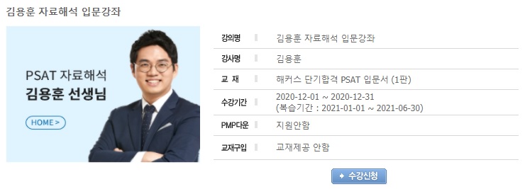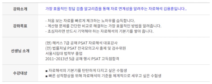 PSAT 자료해석 무료 인강 제목은 <김용훈 자료해석 입문강좌>입니다.