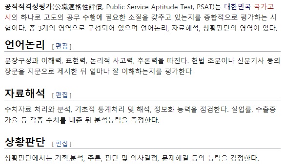 공무원 5급, 7급 시험에서 일부 활용되고 있는 시험으로 언어논리 영역, 자료해석 영역, 상황판단 영역으로 구성되어 있습니다.