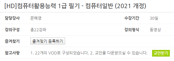 위의 표는 2021 컴퓨터활용능력 1급 컴퓨터일반 과목 강의의 목차입니다. 각 강의가 20~30분 정도 진행돼서 부담없이 수강할 수 있을 것 같습니다. 강의 마지막에는 모의고사도 있어 실전 감각을 키우는 데 도움이 될 것 같습니다.