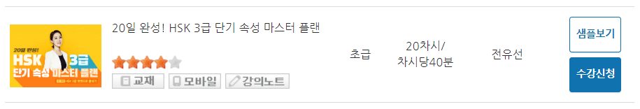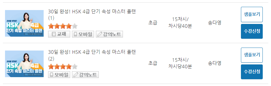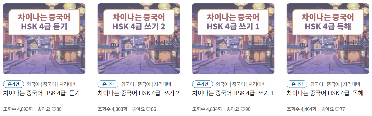 HSK 4급 무료 인터넷 강의입니다. 경기도평생학습포털에서는 ‘차이나는 중국어 HSK 4급, 듣기, 쓰기 1, 쓰기 2, 독해’ 강의를, 서울시교육청 전자도서관에서는 ‘30일 완성! HSK 4급 단기 속성 마스터 플랜 1, 2’ 강의를 수강할 수 있습니다. 경기도평생학습포털 강의는 회원가입 없이도 수강이 가능합니다.