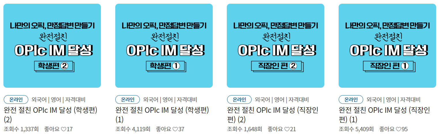 마지막으로 소개하는 사이트는 경기도평생학습포털(GSEEK)입니다. 경기도평생학습포털 역시 회원가입 없이도 OPIc 강의를 무료로 수강할 수 있습니다. 총 4개의 오픽 무료 강의를 제공하고 있습니다. ‘완전 절친 OPIc IM 달성(학생편) 1, 2’, ‘완전 절친 OPIc IM 달성(직장인편) 1, 2’를 수강할 수 있습니다. 오픽 강사인 김보미 선생님은 KT에듀팝i, EBS 중학프리미엄, 파고다, YBM, LG가산 등에서 영어를 가르쳤습니다. 학생편과 직장인편으로 구분된 것이 특징입니다.