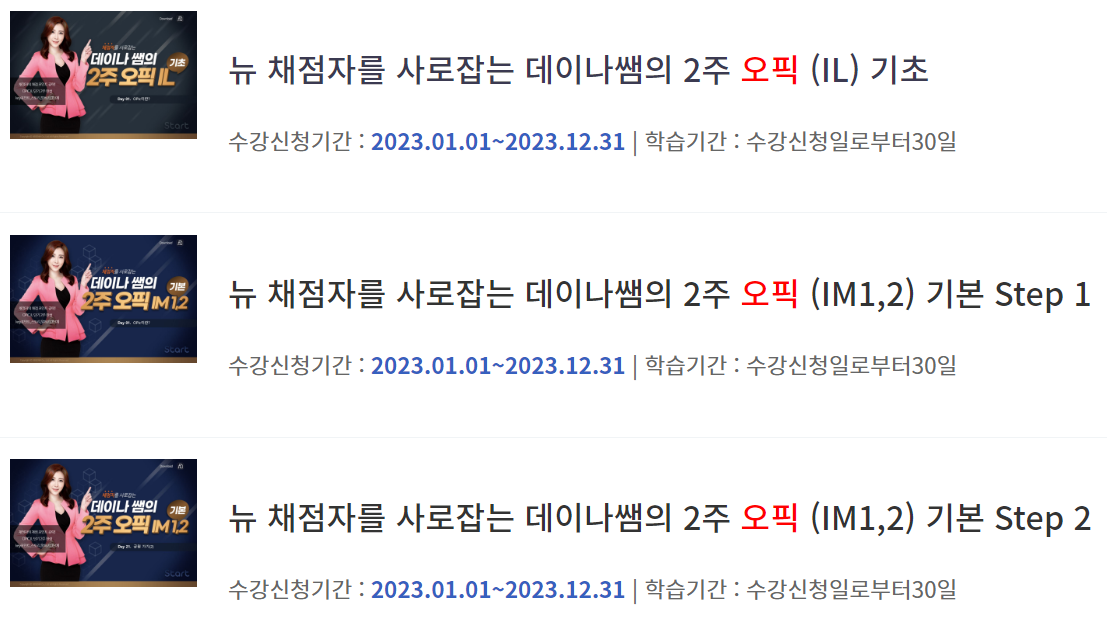 두 번째로 소개할 오픽 무료 강의 사이트는 서울시평생학습포털입니다. 서울시평생학습포털은 회원가입을 하지 않아도 오픽(OPIc) 강의를 무료로 수강할 수 있습니다. 제공되는 강의는 ‘뉴 채점자를 사로잡는 데이나쌤의 2주 오픽 (IL) 기초, (IM1,2) 기본 Step 1, 2’강의입니다. 오픽 점수가 낮은 독학 수험자를 위한 강의입니다.