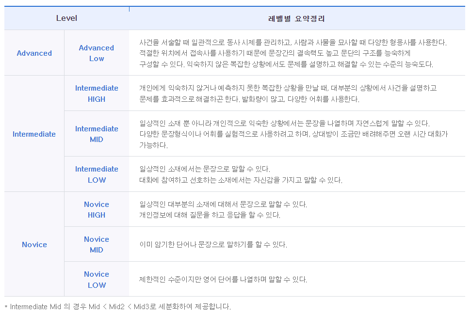 오픽 등급은 Novice Low부터 Advanced Low까지 총 9개로 구분됩니다. Intermediate Mid가 Mid, Mid2, Mid3로 구분되기 때문에 총 9개 등급으로 나뉘고, 오픽 레벨별 내용은 위의 표에서 확인할 수 있습니다.