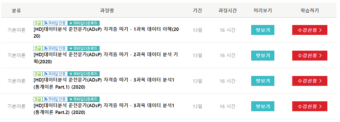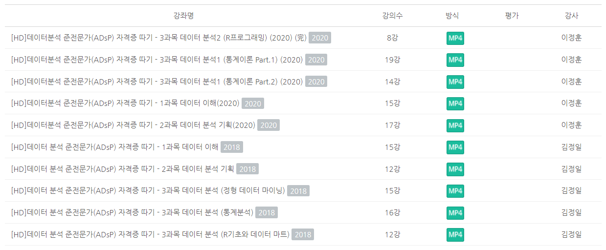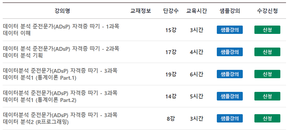 가장 먼저 ADsP 시험일정을 확인했습니다. ADsP 시험은 거의 3개월에 한 번 치러지는데요. 저는 3개월 후에 치러지는 시험 날짜를 보고 계획을 세웠습니다. ADsP 시험일정을 확인하고 100일 정도 기간이 있었는데 많은 사람들이 ADsP를 독학할 때 보는 민트책을 들어가기 전에 ADsP 무료 강의를 통해 한 번 훑어봤습니다. ADsP 무료 인강을 들을 수 있는 사이트를 정리해봤습니다.
