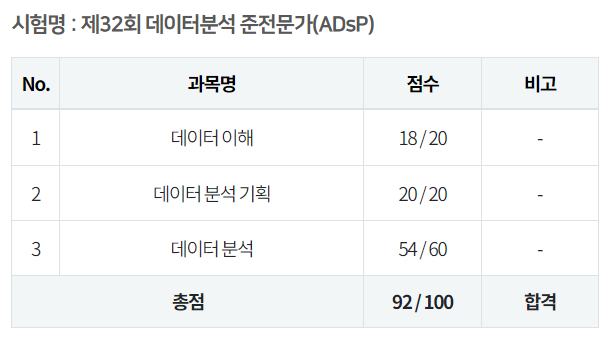 직장인이라 하루에 1시간 정도밖에 공부를 못했는데 ADsP 시험 자체가 기출문제가 많이 반복되는 경향이 있어서 노베이스 독학으로 공부했음에도 고득점으로 합격할 수 있었습니다. 데이터분석 전문가(ADP)나 빅데이터 분석 기사도 공부하고 싶었는데 공사다망하여 아직 시작도 못했네요. 데이터 분석 준전문가를 노베이스 독학으로 공부하는 분들도 충분히 합격할 수 있으니 용기를 얻고 공부하시기 바랍니다.