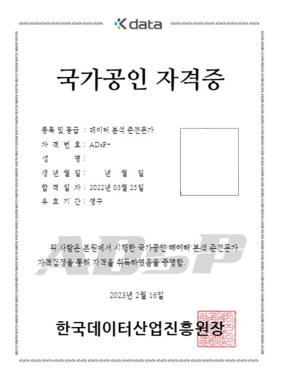 오늘은 1년 전에 데이터분석준전문가(ADsP) 노베이스 독학으로 취득한 후기를 적어보고자 합니다. 정확히는 2022년 2월 26일에 제32회 데이터분석 준전문가 시험에 응시했네요. 컴퓨터나 통계와 관련이 있는 학과를 졸업하지 않았지만 ADsP 민트책과 무료 인강만으로 독학해서 한 번에 합격했습니다. 초등학생 때 방과후에 워드프로세서 공부를 잠깐 했었지만 그 후로 거의 관련 공부를 하지 않았으니 노베이스 독학이라고 봐도 무방하겠죠.