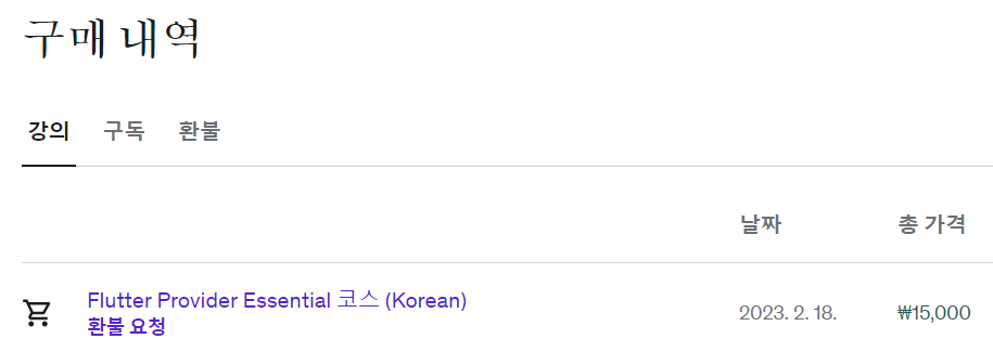 나는 강의를 구입하고 아직 강의를 한 번도 수강하지 않고 30일도 지나지 않았기 때문에 환불을 할 수 있는 조건에 해당된다. 우선 유데미 사이트에 로그인하고 구매 내역으로 들어간다. 구매 내역의 강의 목록을 보면 ‘환불 요청’이라는 문구가 보인다. 이전에 구입한 다른 강의들에는 환불 요청 버튼이 보이지 않았는데 아마 30일이 지나면 없어지는 것 같다.
