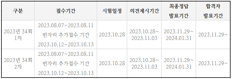 2023년 제34회 1차 2차 공인중개사 자격증 시험은 2023년 10월 28일로 예정되어 있습니다. 공인중개사 접수일은 2023년 8월 7일부터 11일까지입니다. 공인중개사 접수일을 놓치지 않도록 주의하시기 바랍니다. 시험일정은 변동될 수 있으므로 시행기관에서 꼭 확인하시기 바랍니다.