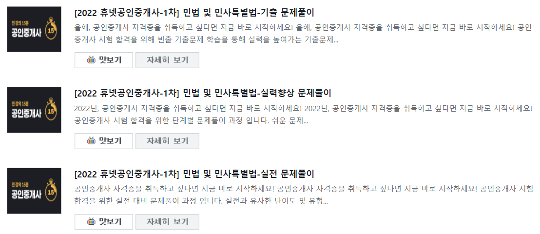 다음은 민법 및 민사특별법 문제풀이 강의입니다. 실력향상 문제풀이, 기출 문제풀이, 실전 문제풀이 총 3개의 문제풀이 강의가 있습니다. 아직 2023년 강의는 올라오지 않았고 2022년 강의만 있습니다.