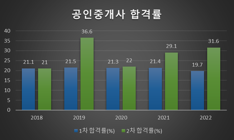 최근 5년 동안의 공인중개사 1차 2차 시험의 합격률입니다. 1차 평균 합격률은 약 21%, 2차 평균 합격률은 28%입니다. 2차 합격률이 1차 합격률에 비해 다소 높습니다.
