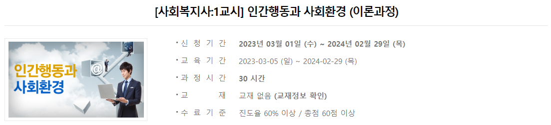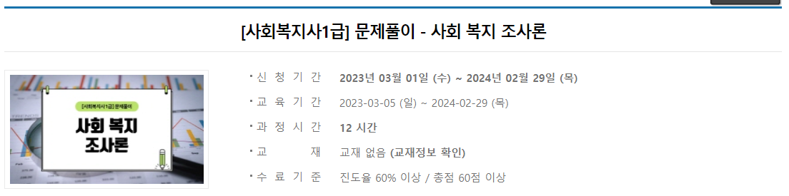 2023년 사회복지사 1급 시험일정이 지나갔습니다. 이제 2024년 사회복지사 1급 시험일정을 준비해야 합니다. 1년마다 시험일정을 준비하는 사회복지사 1급 수험생들은 한 번에 합격하기 위해 에듀윌, 박문각, 해커스 사회복지사 인강 등을 검색해볼 겁니다. 그러나 만만치 않은 사회복지사 수강비용으로 인해 고민하고 있을텐데요. 아래 글에서 소개할 사회복지사 1급 동영상 강의는 무료로 수강이 가능한 강의입니다. 하지만 언제까지 제공될지는 모르기 때문에 무료일 때 지금 미리 수강신청하는 것을 추천합니다.