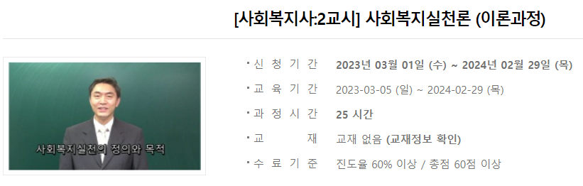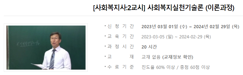 2023년 사회복지사 1급 시험일정이 끝나고 2024년 사회복지사 1급 시험일정을 준비해야 합니다. 1년마다 있는 시험일정을 대비하는 사회복지사 1급 수험생은 한 방에 합격하기 위해 에듀윌, 박문각, 해커스 사회복지사 인강 등을 검색해볼 겁니다. 하지만 만만치 않은 사회복지사 학원 수강비용으로 인해 머뭇거리고 있을텐데요. 아래 글에서 소개할 사회복지사 1급 강의는 누구나 무료로 수강이 가능한 인터넷 강의입니다. 하지만 언제 무료 서비스가 종료될 지 모르기 때문에 지금 미리 수강신청해 두는 것을 추천합니다.