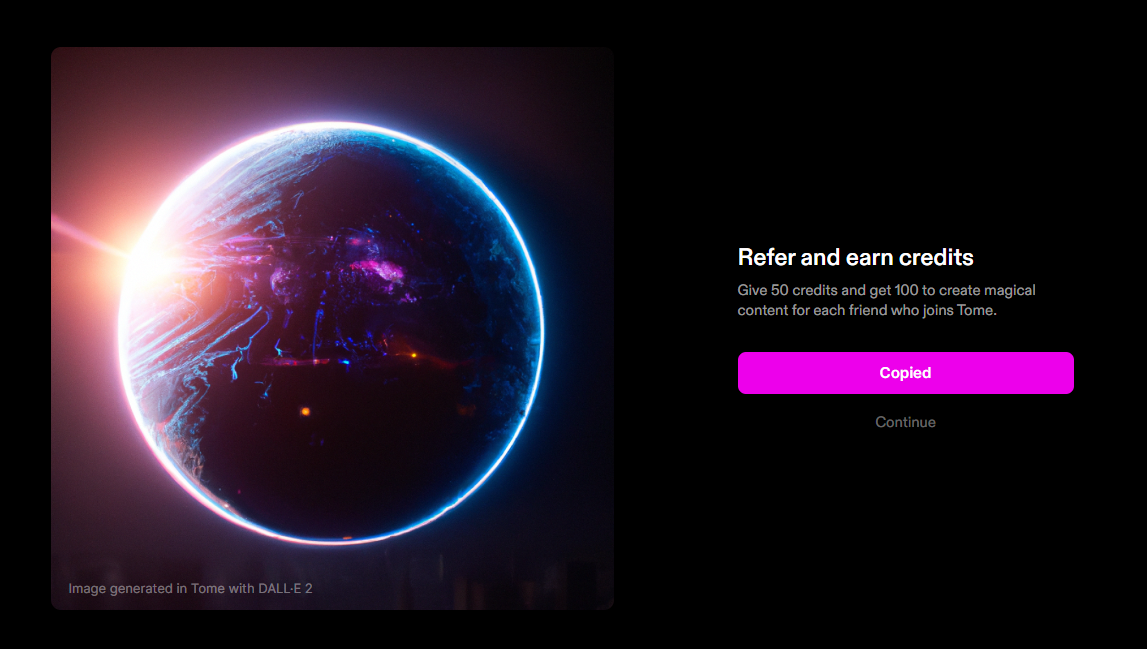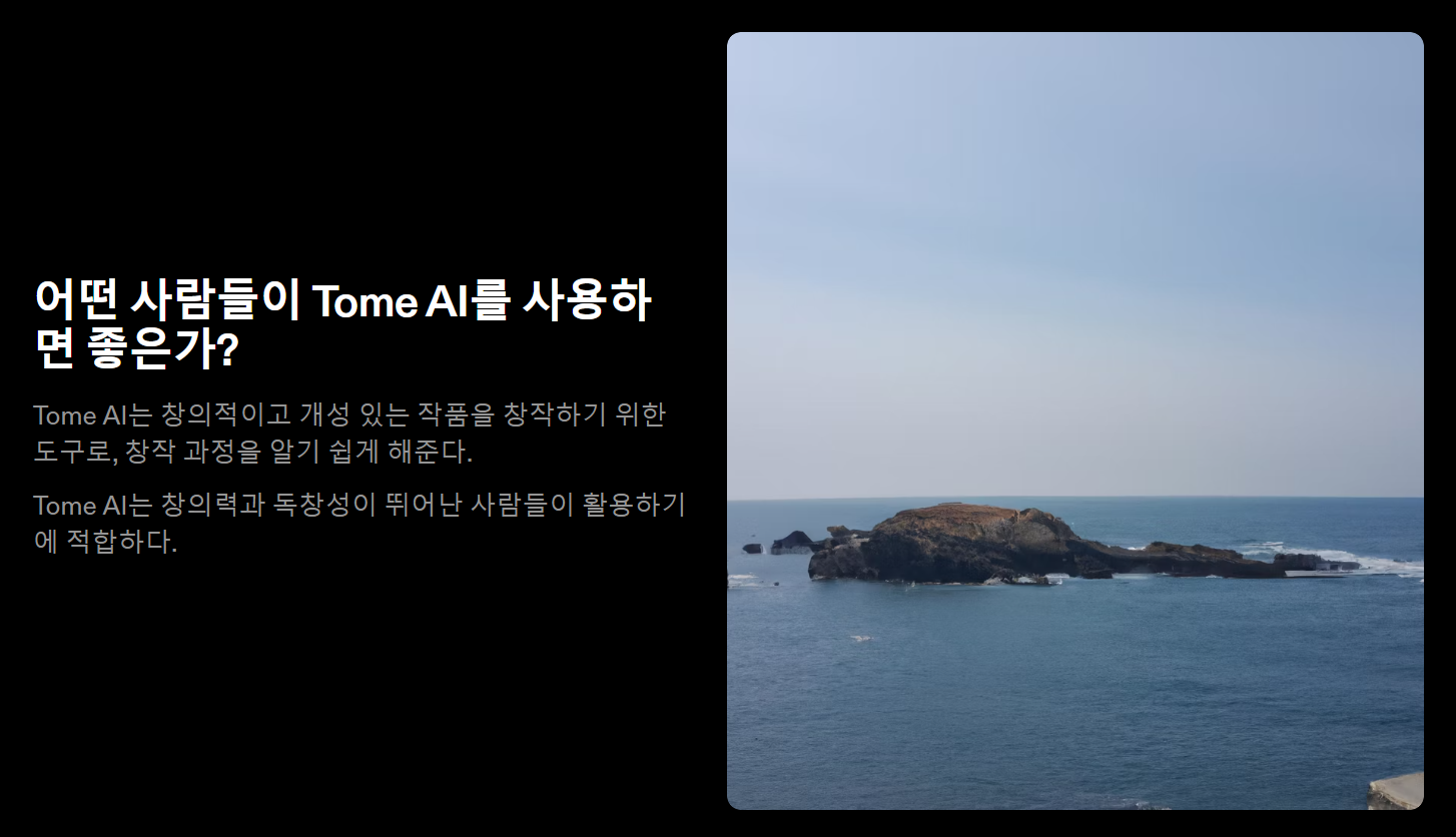 TOME(톰)은 AI 기술을 활용하여 스토리텔링 형식의 컨텐츠를 생성하는 서비스입니다. Tome은 사용자가 입력한 프롬프트를 기반으로 전체 내용을 생성하거나 몇 초 안에 PPT의 추가 페이지를 만들 수 있습니다. 게다가 DALL·E 2를 활용하여 PPT를 더 생동감있게 만들어주는 맞춤 이미지를 생성할 수도 있습니다.