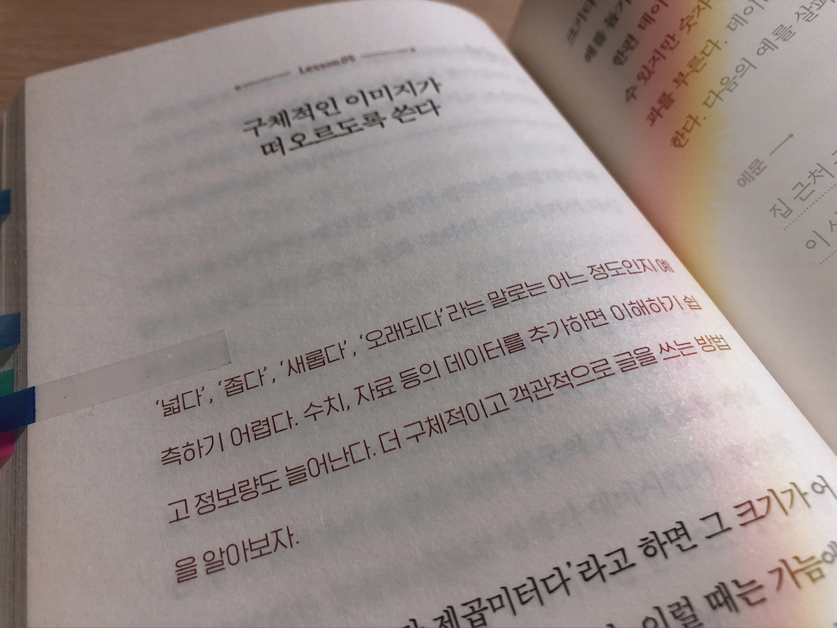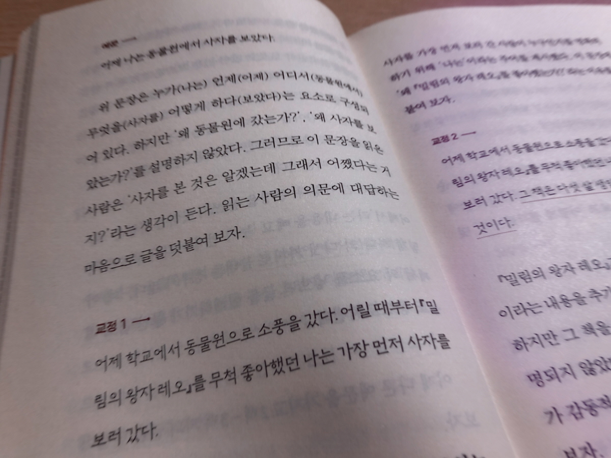 글쓰기 책을 고를 때에는 웬만하면 외국 저자의 책은 고르지 않는 편이다. 번역을 잘 했다고 하더라도 저자가 그 원래의 언어로 말하고자 하는 내용이 번역된 후에는 매끄럽지 않게 읽혔던 경험이 종종 있었기 때문이다. 이 책은 일본인 저자가 쓴 책이지만 책을 다 읽을 때까지 일본어를 번역한 책이라는 생각이 한 번도 들지 않을 정도로 부드럽게 번역되어 있었다.