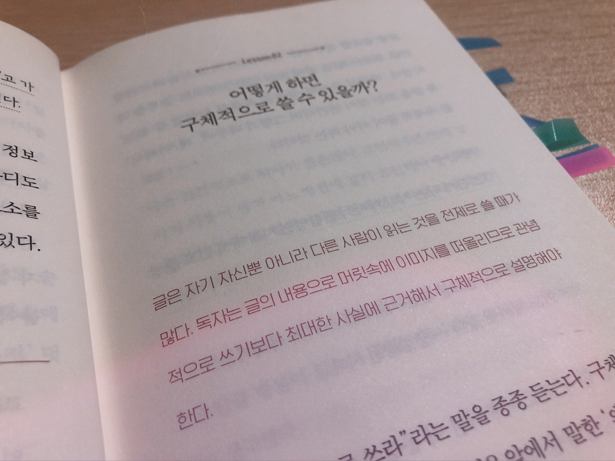 220쪽으로 다소 얇은 두께의 책이라서 글쓰기에 대해 많은 내용을 담고 있지는 않다. 하지만 반대로 글을 이어가는데 꼭 필요한 핵심만 간추렸다고 볼 수도 있다. 이 책의 핵심을 요약하자면 ‘구체적’이고, ‘간단하게’ 글을 쓰라는 것이다. 다른 글쓰기 책에서도 많이 언급한 내용이지만, 이 책에서는 자세한 문장 늘리기 과정을 보여줌으로써 ‘구체적이고 간단하게’ 글을 쓰는 방법을 알려준다.