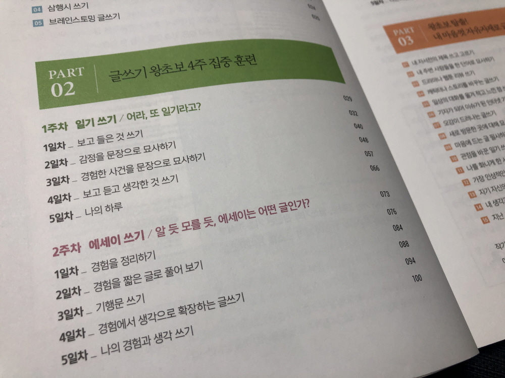 PART1에서 이론에 관한 내용을 짤막하게 설명하고 있고, PART2 ‘글쓰기 왕초보 4주 집중 훈련’에서는 1주차부터 4주차까지 매일 글을 쓰는 과제가 주어진다. PART3에는 ‘드라마 웹툰 리뷰’, ‘기행문 쓰기’, ‘자기소개서 쓰기’ 등 여러 주제에 관해 글을 쓸 수 있는 노트가 있다.