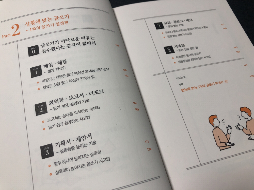 책은 크게 PART1, PART2로 나누어져 있다. PART1에서는 글쓰기를 익히는 다섯 가지 능력인 요약 능력, 논리적 사고, 객관적 사고, 커뮤니케이션 능력, 비판적 사고에 대해 설명한다. PART2에서는 메일ㆍ채팅, 회의록ㆍ보고서ㆍ리포트, 기획서ㆍ제안서, SNSㆍ블로그ㆍ메모, 사과문 등 상황에 맞는 실제 작문 방법을 설명한다.